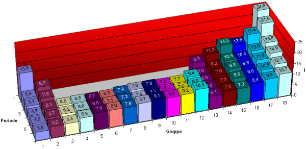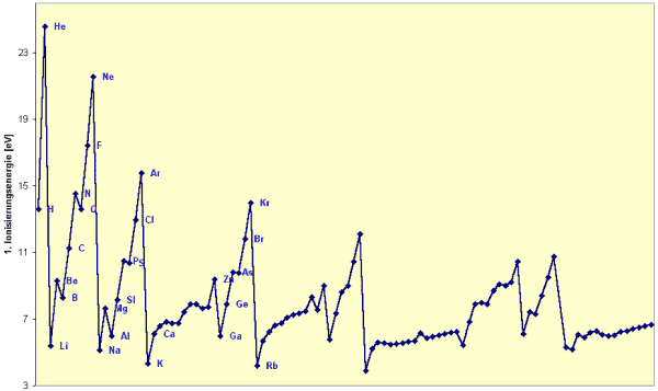 Die Ionisierungsenergie ist eine Eigenschaft, die sich direkt auf die Elektronen in den Atomen bezieht. Daher ist eine periodische Veränderung von I im Periodensystem zu erwarten. Die Ionisierungsenergie ist, anders gesagt, ein Mass für die Festigkeit, mit der ein Elektron an ein Atom gebunden ist.